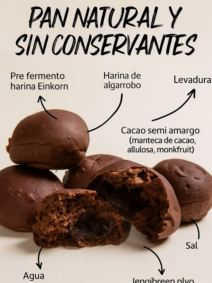 Cada pan se prepara cuidadosamente con pre-fermento natural, harina Einkorn (trigo ancestral), harina de algarrobo, cacao semiamargo (endulzado con allulosa y monkfruit), agua pura, levadura, sal marina, aceite de oliva extra virgen y un toque de jengibre en polvo.